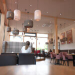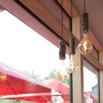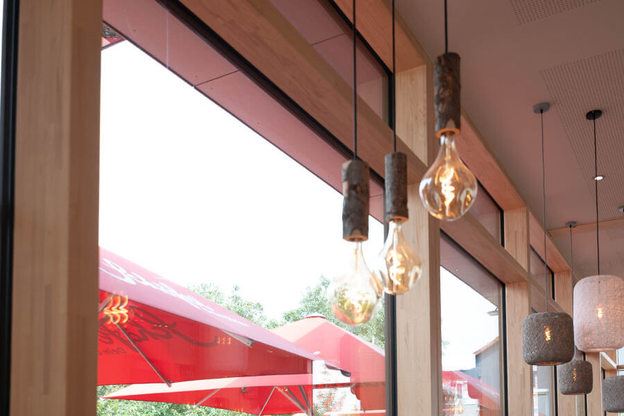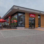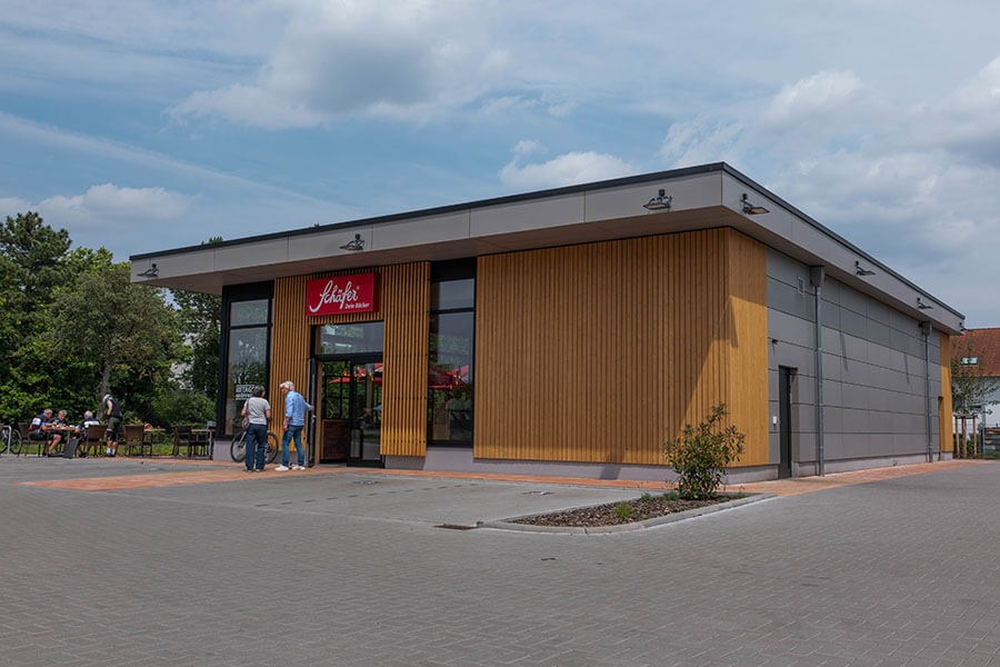 Der gelungene Material-Mix aus Holz, Glas und Faserbeton verleiht dieser Bäckerei mit Café und Außenterrasse sein modernes und architektonisch klares Erscheinungsbild. Als Wegweiser und konstruktiver Sonnenschutz dienen die zusätzlichen vertikalen Holzlammellen rund um die Eingänge. Im Innenraum hebt die natürliche Holzkonstruktion die gemütliche Einrichtung hervor und erzeugt ein angenehm warmes Raumklima zum Wohlfühlen.