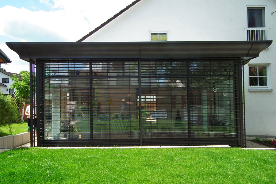 Das geschlossene Wandelement in Holzrahmenbauweise mit hinterlüfteter HPL-Fassade ist der Blickfang dieses Wintergartens. Im Innenraum entsteht ein warmes, natürliches Raumklima durch die finale Holzoberfläche in astfreier Fichte. Die Ganzglasecke verschafft dem Raum Weite und freie Sicht.